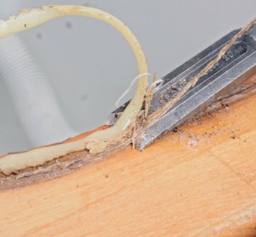 Skjær et spor med en hobbykniv 1-2 mm utenfor streken hele veien rundt. Da unngår du at treet fliser seg opp. Det risikerer du hvis du sager rett i streken.