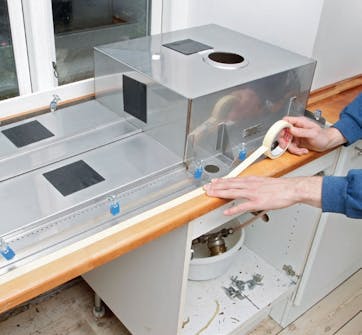Du skal først måle opp hullet til vasken. Vær grundig - hullet må ikke bli for stort, for da er benkeplaten ødelagt. Når du skal måle opp, legger du den nye vasken med bunnen i været over det gamle hullet, og markerer omkretsen på vasken med maskeringsteip. Deretter måler du hvor bred kanten på vasken er. Du skal tegne en ny strek innenfor maskeringsteipen, slik at vasken passer i hullet mens kanten hviler på benkeplaten.