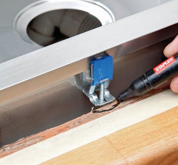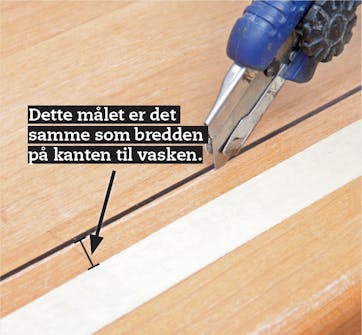 Fjern vasken og sjekk at plasseringen er grei. Mål hvor mye hullet i platen skal være mindre enn vaskens yttermål. Avsett målet fra teipen, og tegn en strek hele veien rundt som du skal sage etter.
