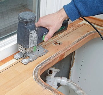 Når du skal skjære ut hullet til vasken, skal du bruke en stikksag med et “friskt” blad. Det kan være nødvendig med et ekstra langt blad hvis det også skal rekke gjennom toppen av kjøkkenskapene.