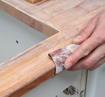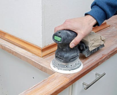 Nå er det smart å fikse benkeplaten. Her har den behov for å bli slipt helt ned. Det gjøres enklest med en eksentersliper eller en plansliper. Er det hakk i platen, kan du starte med korn 60. Avslutt med korn 180.