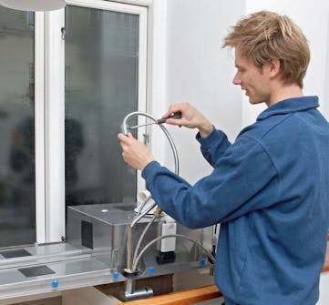 Nå skal vasken snus på hodet igjen, slik at du kan montere bunnventil, rør og blandebatteri. Avløpsrørene skal festes til vasken, slik at de bare skal kobles til når vasken er på plass i benkeplaten.