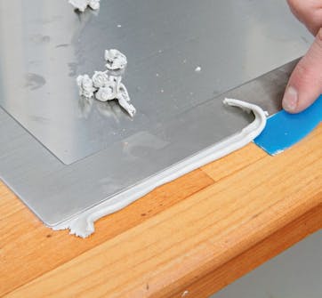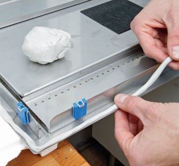 Trykk fast en pølse sanitærkitt hele veien rundt i kanten av vasken. Rull sanitærkittet mellom håndf atene, slik at det blir enkelt å forme. Bruk heller for mye enn for lite kitt.