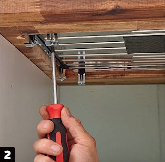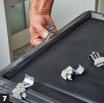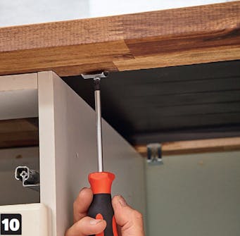 Spenn fast vasken til benkeplaten. Det gjør du ved å presse ned klembeslagene så de får tak i benkeplaten. Når de har fått tak, spenner du dem fast med en skrutrekker.