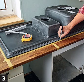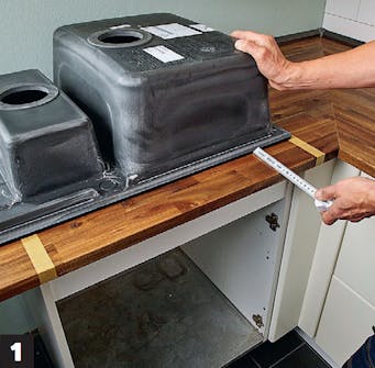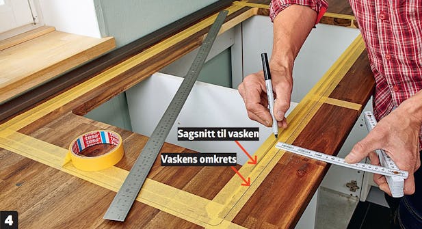Tegn tydelig opp, for eksempel med en sprittusj hele veien rundt vasken. Da kan du se akkurat hvor vasken skal plasseres i benkeplaten.