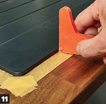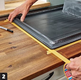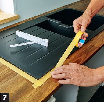 Vaskens nøyaktige plassering markeres med teip hele veien rundt. Det gir deg muligheten til å tegne opp plasseringen direkte på benkeplaten.