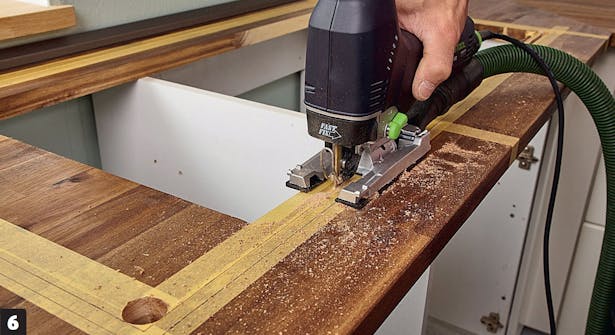 Sag hull til den nye vasken med en stikksag langs den innerste streken. Det er viktig at du har tegnet streken fullt ut hele veien rundt, slik at du hele tiden har et nøyaktig styrepunkt til sagen. Det kan også være nødvendig å sage helt inn i hjørnene der du har boret hull.