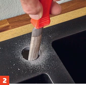 Slip benkeplaten i kanten der den nye vasken skal sitte. Det kan ikke unngås at treet flises opp litt når du har saget med stikksagen. Bruk for eksempel en slipekloss med slipepapir i korn 120.