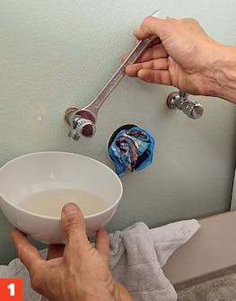 Fjern den gamle kuleventilen. Den løsnes med en fastnøkkel etter at du har stengt vannet. Hold en skål under, så du ikke får vann i underskapet. Selv om du har stengt vannet, vil det være vann i røret, som renner ut når du fjerner kuleventilen.