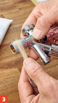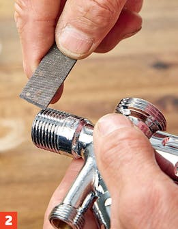 Lag en risse på tvers av gjengene i den nye kranen. Det gjør du lettest med en fil. Når du har risset gjengene, sikrer du at pakkgarnet blir sittende skikkelig fast.