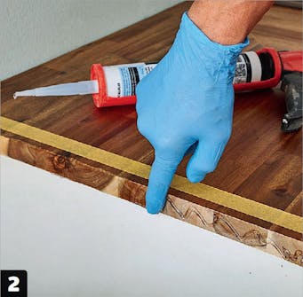 Plasser vasken i hullet i benkeplaten. Stripen av silikon på undersiden skal helst ligge midt i den 12 mm brede kanten som vasken skal hvile på.