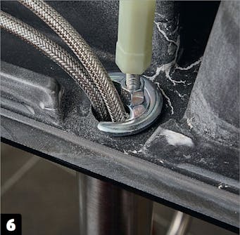 Vannrørene til armaturet skrus fast. Det gjøres med en spesiell halvring, som settes ned i hullet og spennes fast med en mutter. Når vannrørene til armaturet er spent fast, sitter også armaturet fast.