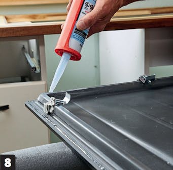 Før du snur vasken rundt og legger den på plass i hullet, legger du en stripe silikon langs kanten. Overskytende silikon fjernes med en fugebrikke.
