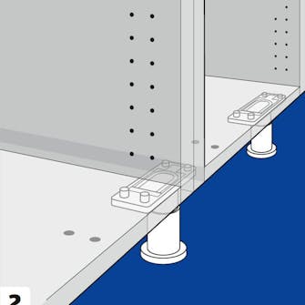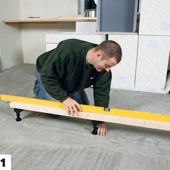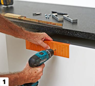 Skru fast sokkelføttene under skapet - eller som her på en lekt, der vi setter en kjøkkenøy oppå. Tilpass høyden ved å skru på sokkelføttene til skapet eller lekten er i vater.