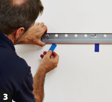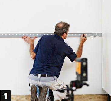 Tegn opp til opphengsskinnen. Avstanden fra gulvet til underkanten av skinnen avhenger av høyden på skapet og påvirker også hvor mye luft som er tilgjengelig for sokkelen. Her er et laservater til stor hjelp.
