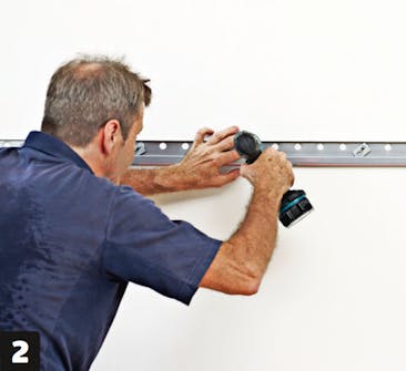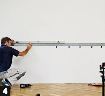 Spenn skinnen løst opp. Hullene i skinnen er større enn skruehodet, så du setter skruene i veggen først, hekter skinnen på dem og setter deretter på spesialskivene som kan justere høyden på skinnen.