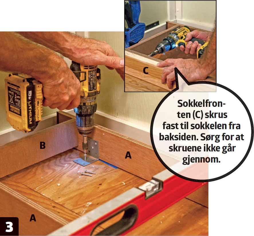 Sokkelen plasseres på gulvet, slik at fronten får ønsket avstand til fronten på skapene. Den justeres på plass med avstandsklosser og festes til gulvet.