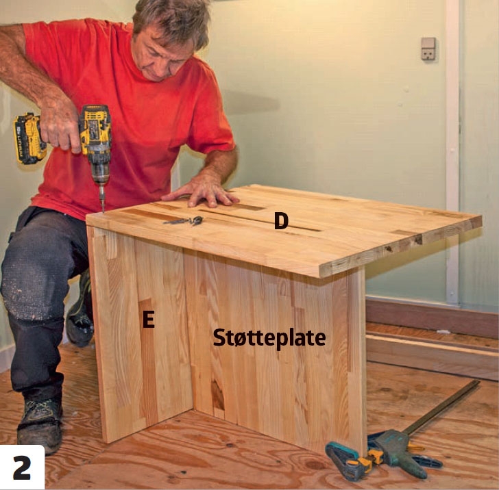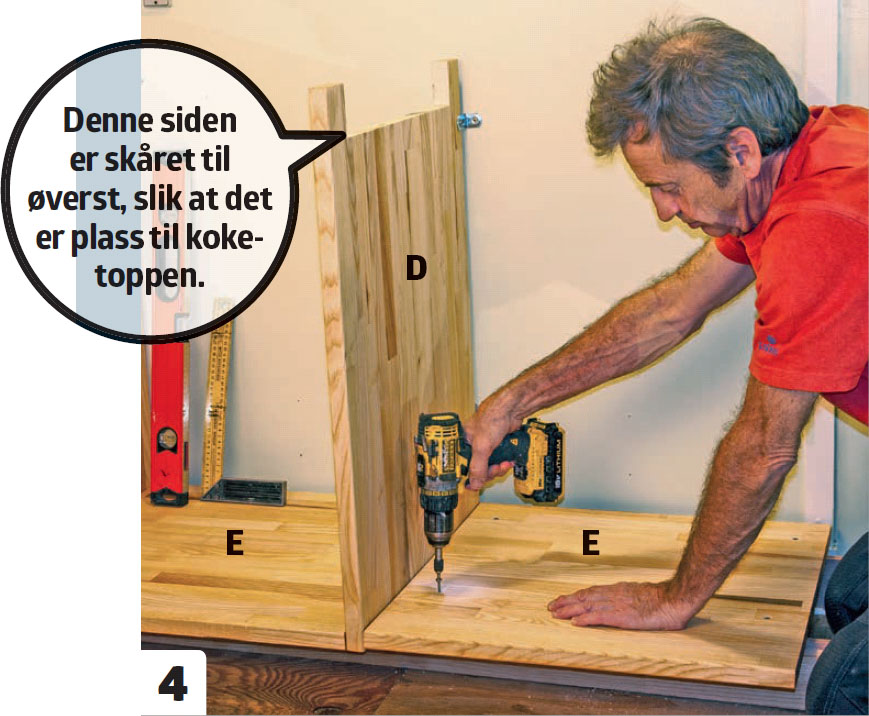 Første skapside (D) og bunn (E) skrus sammen gjennom skapsiden, slik at den kan bli gavlen i venstre side. Forbor før du skrur, slik at du ikke risikerer at treet sprekker. Her brukes tre 4,5 x 60 mm skruer.