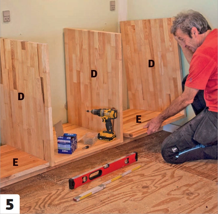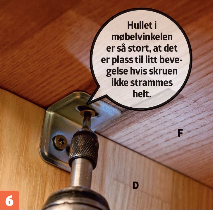 Benkeplaten (F) legges på plass. Den skrus fast til skapsidene (D) med møbelvinkler. Det er smart å feste de innerste på alle sider før platen legges opp. Da er det enklere å komme til.