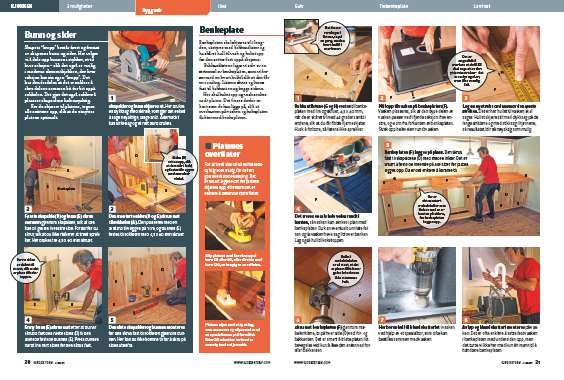 Bakkantlistene (G og H) festes til benke platen med lim og skruer, 4,5 x 40 mm, når de er skåret til med 45 graders snitt i endene, slik at du får flotte hjørneskjøter. Husk å forbore, så listene ikke sprekker.