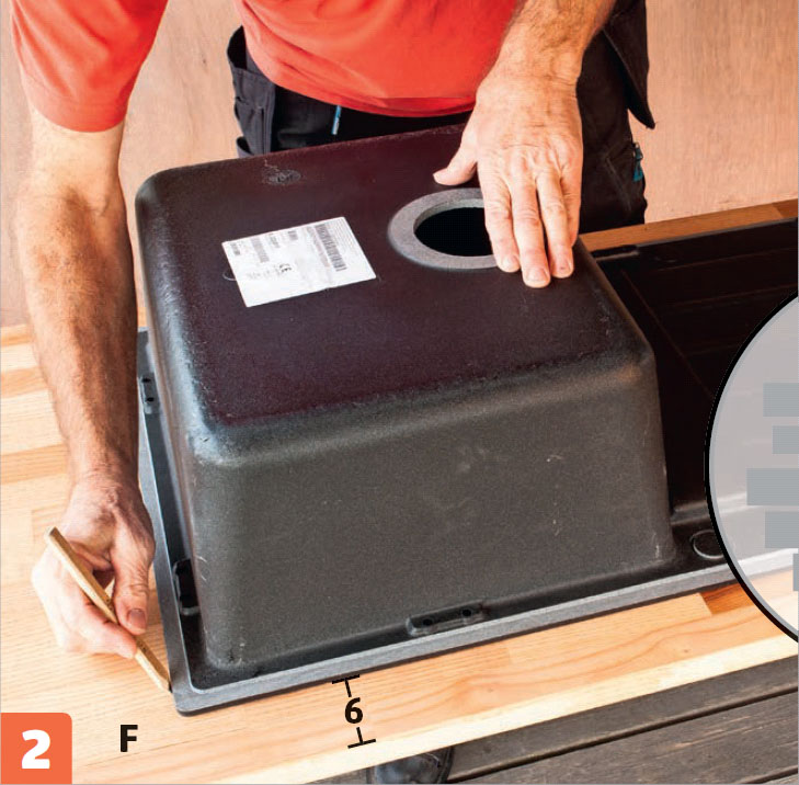 Mål opp til vasken på benkeplaten (F). Vasken plasseres, slik at den dype delen av vasken passer ned i fjerde seksjon fra ven stre, og 6 cm fra forkanten av benkeplaten. Strek opp hele veien rundt vasken.