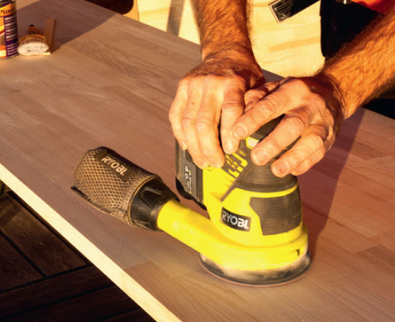 Benkeplaten skal skjæres til i lengden, utstyres med bakkantlister og ha skåret hull til vask og koketopp før den settes fast oppå skapene.
