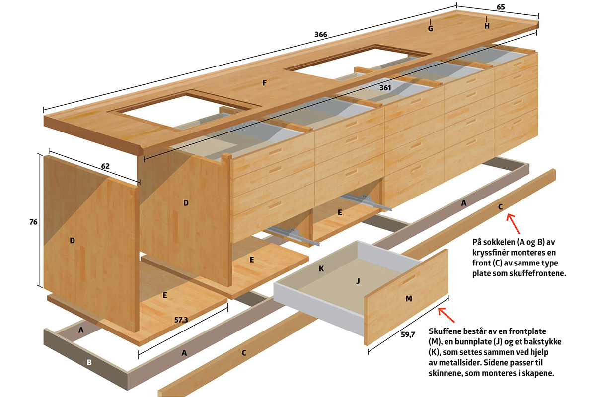 Bunnplater (J) og bakstykker (K og L) skjæres ut i kryssfinér. Platens dybde skal tilsvare skuffens metallside, heller for kort enn for lang. Bredden skal tilsvare skapets åpning, minus 62 mm.