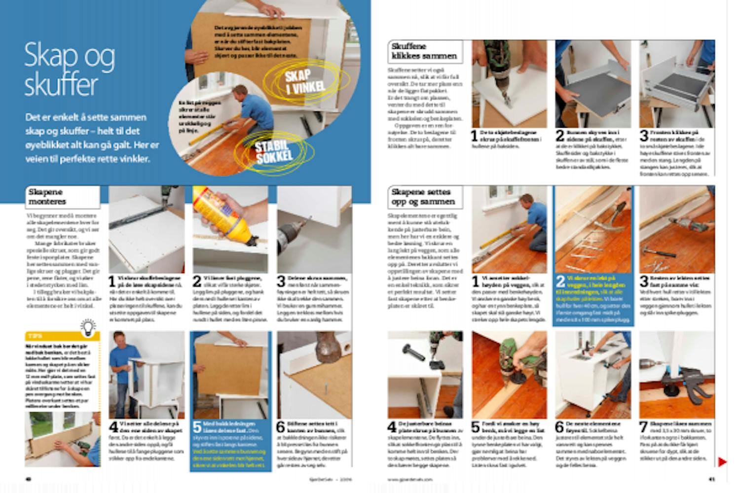 Skuffene setter vi også sammen nå, slik at vi får full oversikt. De tar mer plass enn når de ligger flatpakket. Er det trangt om plassen, venter du med dette til skapene er skrudd sammen med sokkelen og benkeplaten.