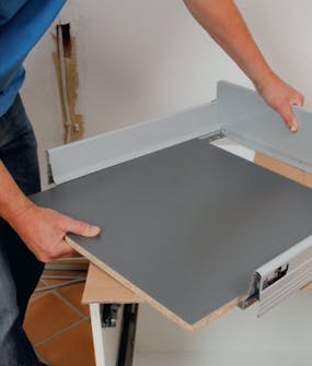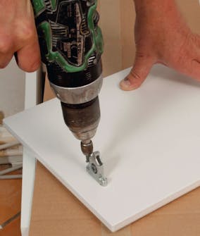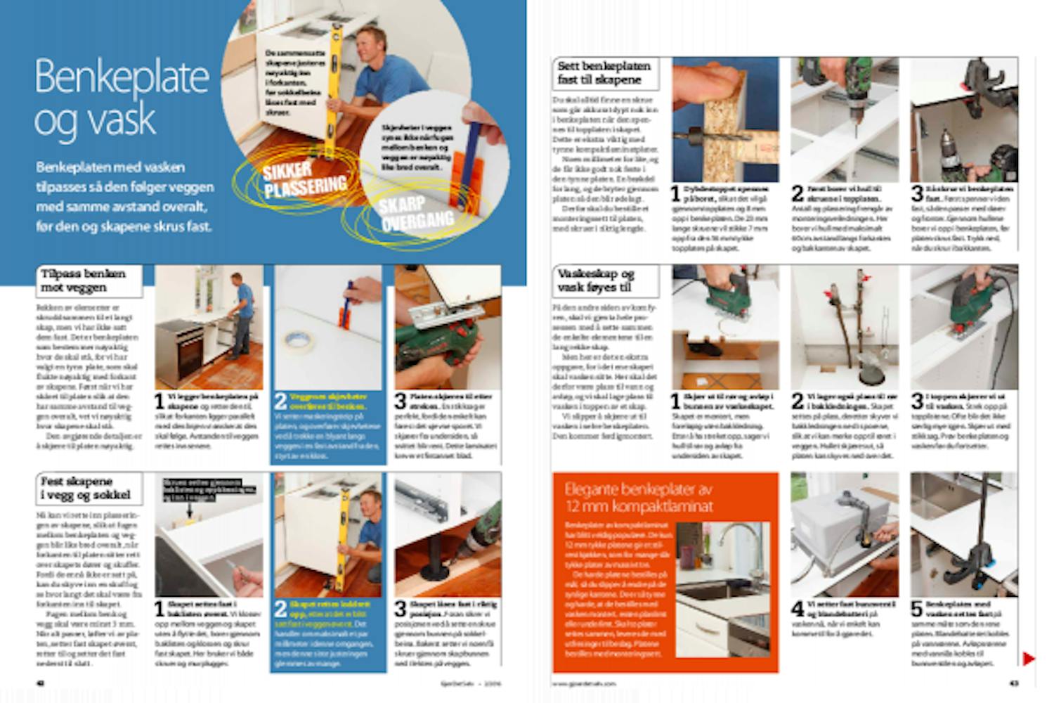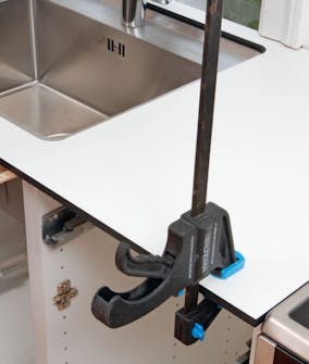 Du skal alltid finne en skrue som går akkurat dypt nok inn i benkeplaten når den spennes til topplaten i skapet. Dette er ekstra viktig med tynne kompaktlaminatplater.