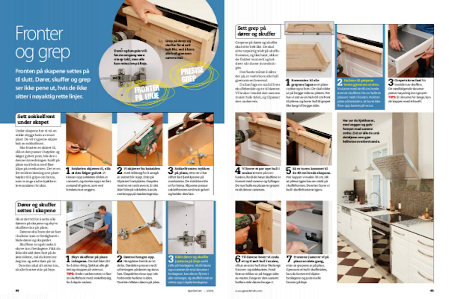 Grepene på dører og skuffer skal sitte helt likt. De skal sitte nøyaktig midt på skuffefrontene, og like høyt, slik at de flukter vannrett og loddrett når du ser innredningen.