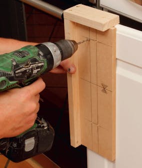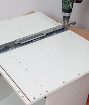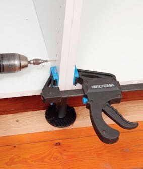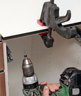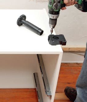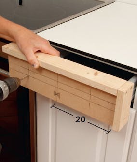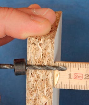 Dybdestoppet spennes på boret, slik at det vil gå gjennom topplaten og 8 mm opp i benkeplaten. De 23 mm lange skruene vil stikke 7 mm opp fra den 16 mm tykke topplaten på skapet.