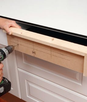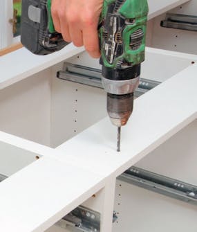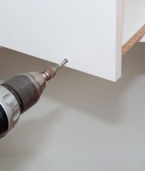 Først borer vi hull til skruene i topplaten. Antall og plassering fremgår av monteringsveiledningen. Her borer vi hull med maksimalt 60 cm avstand langs forkanten og bakkanten av skapet.
