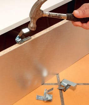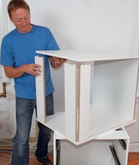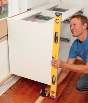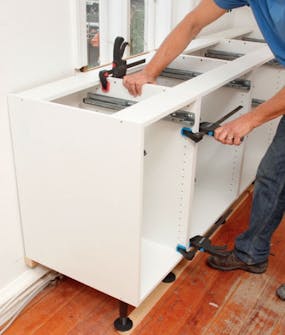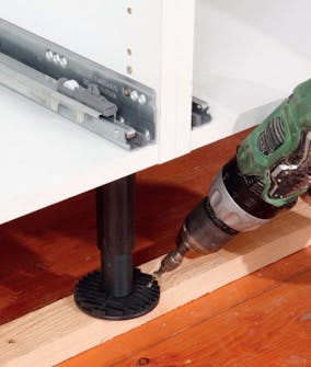 De justerbare beinas plate skrus på bunnen av skapelementene. De flyttes inn, slik at sokkel fronten gir plass til å komme helt inn til benken. Der to skap møtes, settes platen så den bærer begge skapene.