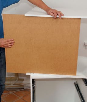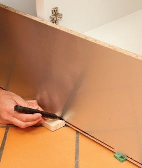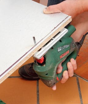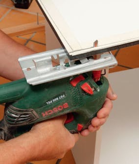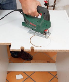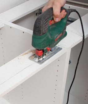 Vi skjærer fra baksiden med stikksag for å unngå at snittet blir stygt. Etterpå tilpasses frontplaten i høyden med et rett snitt øverst. Er det ikke folie på sokkelen, kan du streke opp på maskeringsteip.
