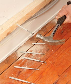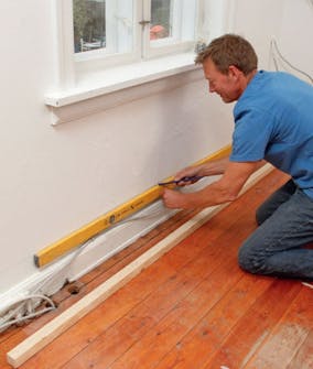 Sokkelen skjæres til, slik at den følger gulvet. Vi klosser opp sokkelen til den er vannrett, og streker opp i en fast avstand til gulvet, som ved benken mot veggen.