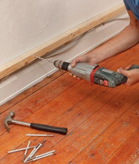 Resten av lekten settes fast på samme vis: Ved hvert hull retter vi til lekten etter streken, borer inn i veggen gjennom hullet i lekten og slår inn spikerpluggen.