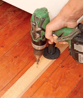 Fordi vi ønsker en høy benk, må vi legge en list under de justerbare beina. Den tynne benkeplaten vi har valgt, gjør nemlig at beina har problemer med å rekke ned. Listen skrus fast i gulvet.