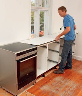 Rekken av elementer er skrudd sammen til et langt skap, men vi har ikke satt dem fast. Det er benkeplaten som bestemmer nøyaktig hvor de skal stå, for vi har valgt en tynn plate, som skal flukte nøyaktig med forkant av skapene. Først når vi har skåret til platen slik at den har samme avstand til veggen overalt, vet vi nøyaktig hvor skapene skal stå.