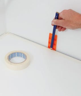 Veggenes skjevheter overføres til benken. Vi setter maskeringsteip på platen, og overfører skjevhetene ved å trekke en blyant langs veggen i en fast avstand fra den, styrt av en kloss.