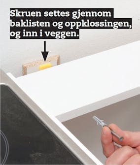Skapet settes fast i baklisten øverst. Vi klosser opp mellom veggen og skapet uten å flytte det, borer gjennom baklisten og klossen og skrur fast skapet. Her bruker vi både skruer og murplugger.