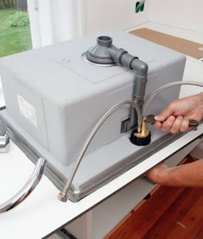 Vi setter fast bunnventil og blandebatteri på vasken nå, når vi enkelt kan komme til for å gjøre det.