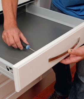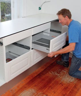Skyv skuffene på plass i skapene. De skal lirkes litt for å sitte riktig. Sjekk at alle glir lett og stopper på veien ut. TIPS: Under vasken setter vi fast en skuff efront med vinkelbeslag, for å skjule vasken.