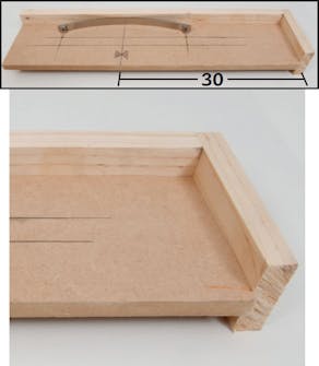 Boremalen til alle grepene lages av et plate stykke og to lister. De skal stikke ut på begge sider av platen. Her har vi satt av en halv 60 cm front til pilene, og borer hull til grepet like langt til begge sider.