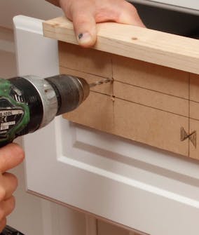 Vi borer et par nye hull i malen tettere på over kanten, fordi de høye skuffene er formet med ramme og fyllinger. De nye hullene plasserer grepet midt denne rammen.
