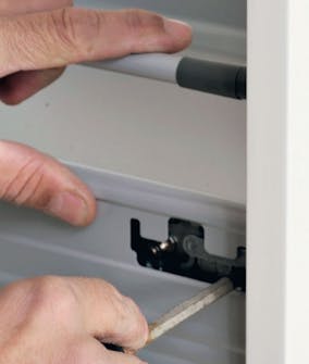 Dørene henges opp. Hengslene består av to deler. Dørdelen presses ned i utfresingen på døren og skrus fast. Skapdelen skrus opp i de forborede hullene i siden. Deretter klikkes døren på plass.