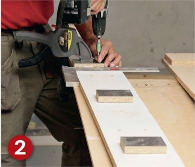 Bak på fronten setter vi klosser, som sokkelens tverrstykker kan sitte på. Da unngår vi skruehull i forsiden av sokkelen. Du kan også bruke små vinkelbeslag, men små sponplatebiter gir en god stabilitet.