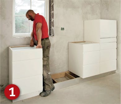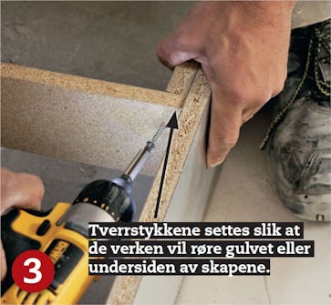 Når du har gjort et godt stykke arbeid med sokkelen, skal elementene bare stables oppå den. Når sokkelen står riktig, vil også skapene stå rett - det er bare å skru dem sammen. Men først må du selvsagt skjære hull til rør og ledninger, og kanskje til vasken også.