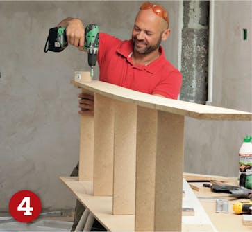 Bakstykket skrus på tverrstykkene uten klosser, her synes ikke skruehodene uansett. Her er det også en god idé å forbore, slik at du ikke svekker den delen av sponplaten hvor skruen kjøres inn fra kanten.