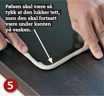 Så ruller du ut en klump med sanitærkitt til en pølse, og trykker den lett fast i kanten av hullet - Sjekk først at vasken passer og ikke butter i skapet. Obs!: Det følger ofte med tetting på nye vasker.