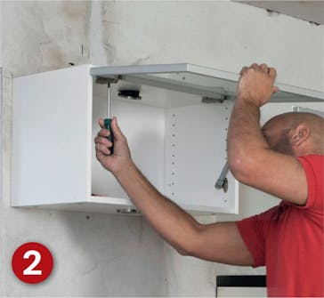Løft skapet på plass - den skrå kanten på undersiden av listen bak på skapet griper fatt i vegglistens skrå overkant. Vi setter vegglisten litt for høyt; skapet vil alltid sette seg litt, avhengig av veggtype.